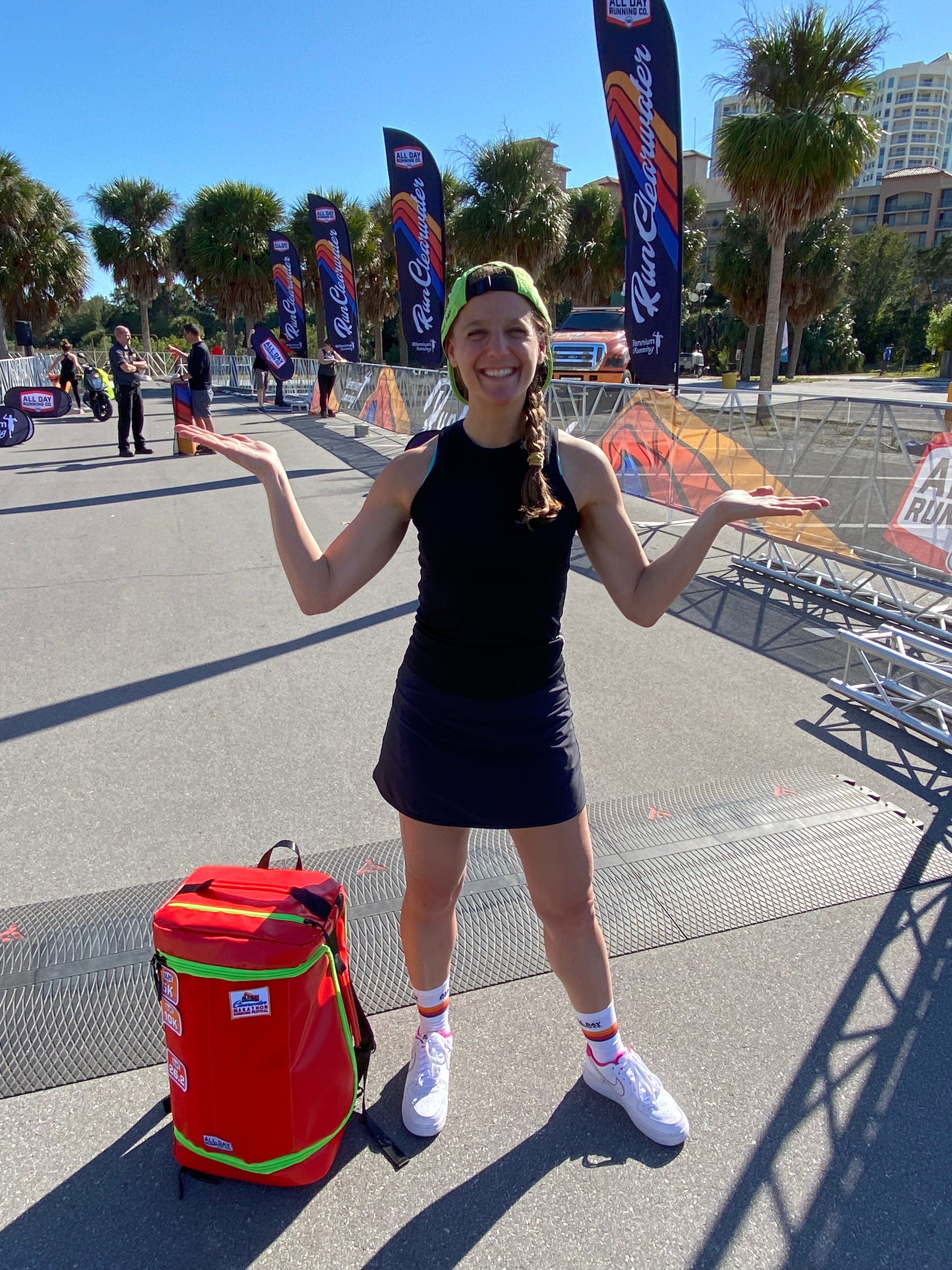 BIG THANKS to All Day Running Co. for sponsoring this edition of the Ali on the Run newsletter. That’s me in Florida, at the All Day Running Co. Clearwater Marathon Festival, with my All Day duffel, socks, and hat! I’m obsessed with this backpack/duffel bag. (It’s both! With a compartment for your sweaty running shoes!)